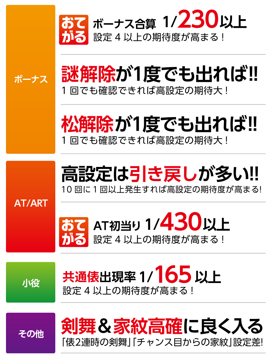 俵2連以降、通常時及びAT中では剣舞高確抽選が行われ、BIG中には上乗せ特化ゾーンの抽選と様々な場面で活躍する。ゆえに俵が一度成立すると次ゲームが楽しめる=ワクワクポイントが多く訪れるってことで、良いスパイスになってます!!