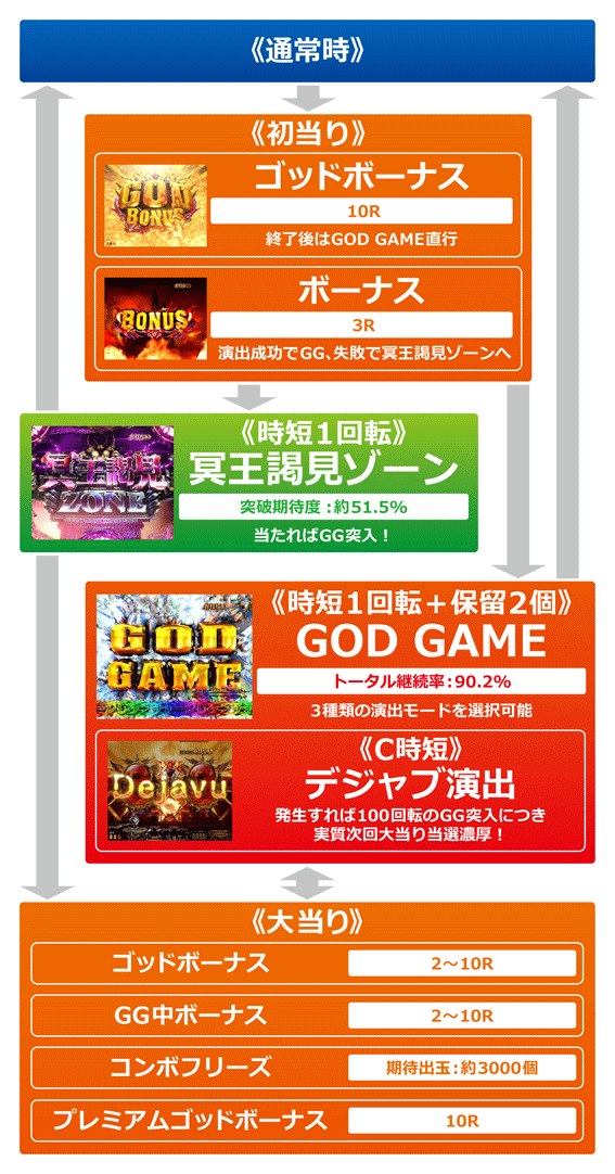 初当りの30%がGOD GAME(GG)直行、70%が冥王謁見ゾーンに突入。冥王謁見ゾーンでは、約1/1.94の大当りを1回転で引くことができればGGに突入する。なお、GGへのトータル突入率は約66%となっている。